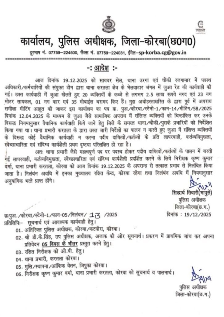 मामले को गंभीरता से लेते हुए कोरबा पुलिस अधीक्षक ने करतला थाना प्रभारी निरीक्षक कृष्ण कुमार चंद्रा को इस लापरवाही का जिम्मेदार माना है। जुआ अड्डों पर समय रहते कार्रवाई नहीं करने और क्षेत्र में अवैध गतिविधियों को रोकने में विफल रहने के आरोप में उन्हें तत्काल प्रभाव से निलंबित कर लाइन अटैच कर दिया गया है।