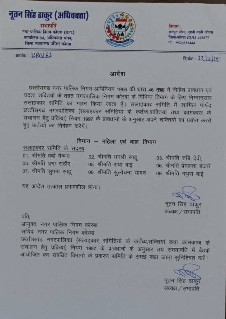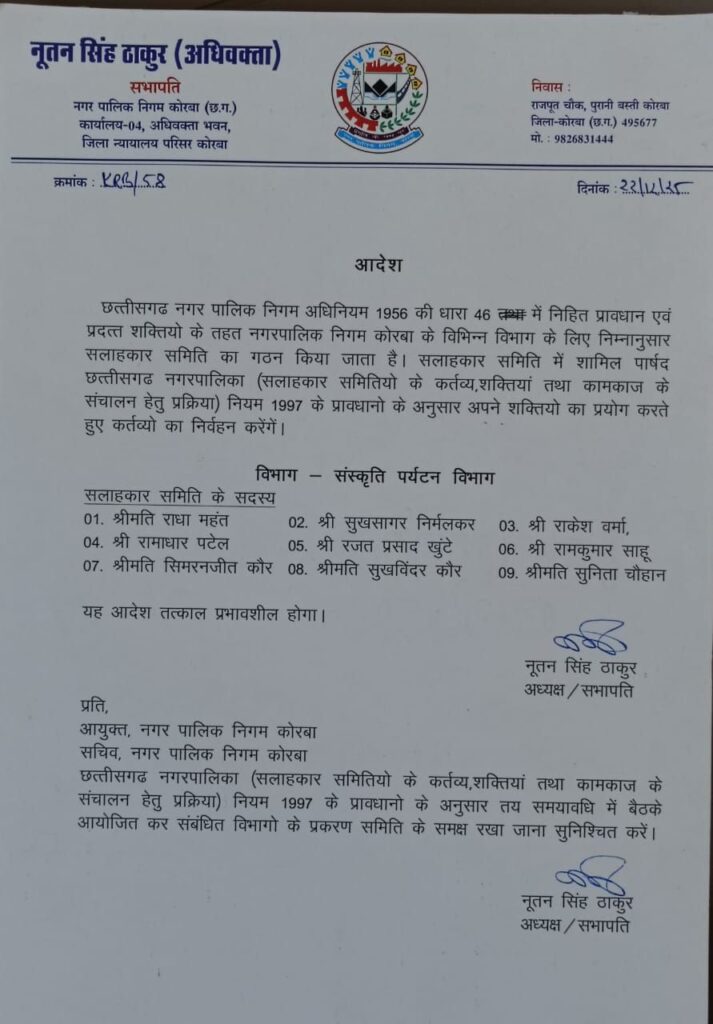 कोरबा 22 दिसंबर 2025/नगर पालिका निगम कोरबा के सभापति व अध्यक्ष नूतन सिंह ठाकुर ने छत्तीसगढ़ नगर निगम अधिनियम के तहत विभिन्न सलाहकार समितियां का गठन किया है। निगम सभापति नूतन सिंह ठाकुर ने इससे पहले भी दो समितियां का गठन किया था, इस बार चार विभागों के लिए गठित समितियां में 36 पार्षदों को स्थान दिया गया है जिसमें भाजपा, कांग्रेस और निर्दलीय पार्षद शामिल हैं। निगम अध्यक्ष नूतनसिंह ठाकुर द्वारा अधिनियम की धारा 46 के तहत आदेश जारी कर उद्यानिकी विभाग के सलाहकार समिति में तरुण राठौर, विनम्र तिवारी, बद्री किरण, अनुज जायसवाल, चेतन सिंह मैत्री, श्रीमती चंदाबाई, श्रीमती सीमा कंवर ,श्रीमती चंद्रकाली जायसवाल, श्रीमती सम्मत कुंवर कों शामिल किया गया है। इसी प्रकार जल कार्य विभाग समिति में युगल कैवर्त , पंकज देवांगन, ईश्वर पटेल, कृपाराम साहू, मुकुंद सिंह कंवर, गोपाल कुर्रे, उपेंद्र पटेल, सुभाष राठौड़ और बहत्तर सिंह शामिल किए गए हैं। महिला एवं बाल विभाग समिति में निगम के महिला पार्षदों को शामिल कर समिति बनाया गया है जिसमें श्रीमती वर्षा वैष्णव, श्रीमती धनश्री साहू, श्रीमती रूबी देवी, श्रीमती प्रभा राठौर, श्रीमती राधाबाई, श्रीमती प्रेमलता बंजारे, श्रीमती सुषमा साहू, श्रीमती सुलोचना यादव, श्रीमती मथुरा बाई को शामिल है। संस्कृति एवं पर्यटन विभाग समिति में श्रीमती राधा महंत, सुखसागर निर्मलकर, राकेश वर्मा, रामाधार पटेल, रजत खुटे, रामकुमार साहू, श्रीमती सिमरनजीत कौर, श्रीमती सुखविंदर कौर, श्रीमती सुनीता चौहान को शामिल करते हुए समिति गठित की गई है।