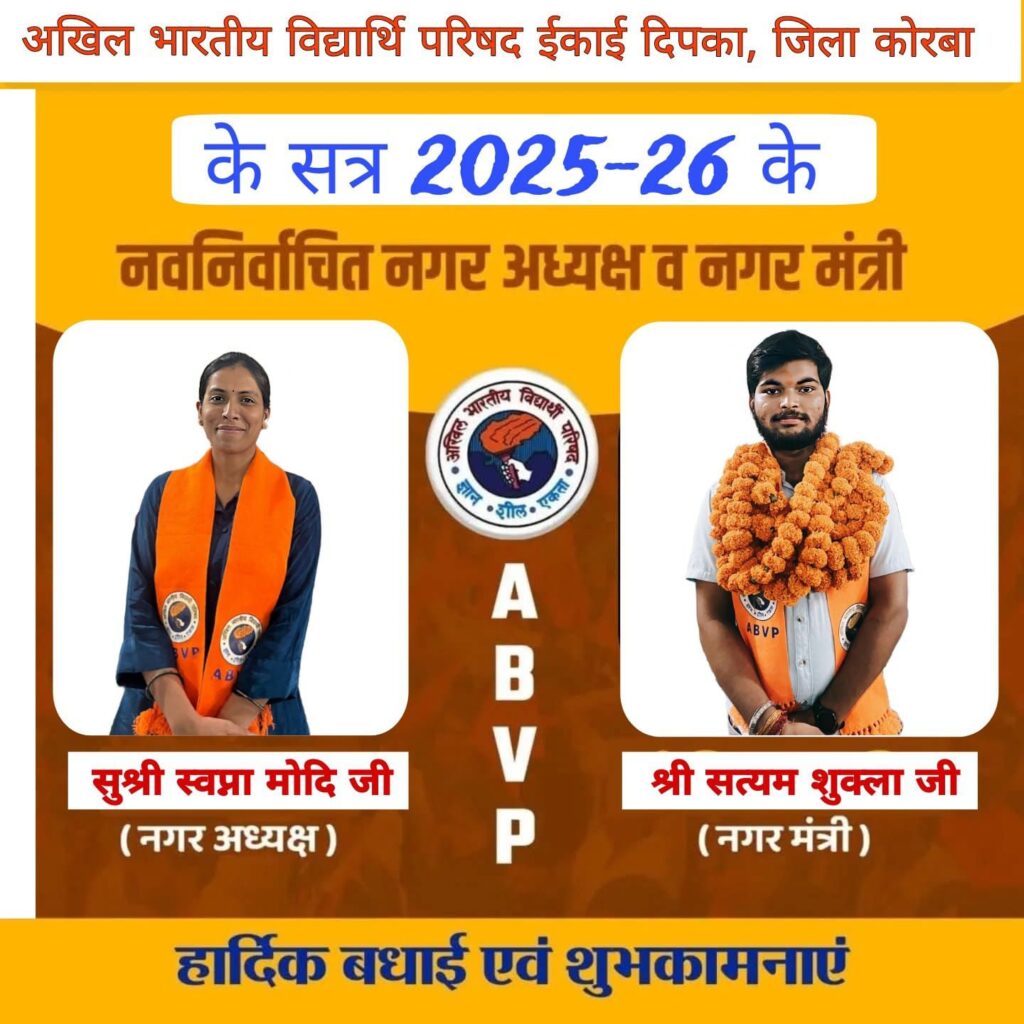 बैठक में वरिष्ठ कार्यकर्ताओं और अतिथियों की उपस्थिति में एबीवीपी दीपका नगर की नई कार्यकारिणी की घोषणा की गई नगर अध्यक्ष बनीं स्वप्ना मोदी – नगर मंत्री का दायित्व सत्यम शुक्ला को बनाए गया ,इस अवसर पर समाज सेवक एवं चारक धर्म संवाहक के संस्थापक श्री सत्य प्रकाश मिश्रा ने एबीवीपी के महत्व पर प्रकाश डालते हुए कहा कि संगठन छात्रहित और राष्ट्रहित की दिशा में निरंतर कार्यरत है।
