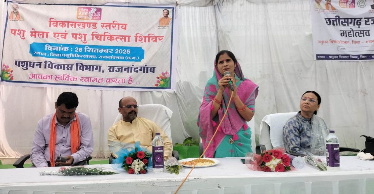 राजनांदगांव 27 सितम्बर 2025।छत्तीसगढ़ रजत महोत्सव के अवसर पर पशुधन विकास विभाग द्वारा विकासखण्ड स्तरीय पशु मेला एवं पशु चिकित्सा शिविर का आयोजन पशु चिकित्सालय राजनांदगांव में किया गया। कार्यक्रम में मुख्य अतिथि के रूप में जिला पंचायत अध्यक्ष श्रीमती किरण वैष्णव शामिल हुए। मेला प्रदर्शनी के तहत चारा प्रसंस्करण, यूरिया उपचार, साइलेज निर्माण एवं अजोला उत्पादन के स्टॉल लगाए गए थे। जिसका अतिथियों एवं किसानों ने निरीक्षण किया और इसके संबंध में जानकारी ली। इस दौरान पशुओं का टीकाकरण किया गया। बीमारी पशुओं का उपचार भी किया गया। पशुओं को गंभीर बीमारी के लक्षण पाए जाने पर पशु चिकित्सालय लाने की सलाह दी गई।