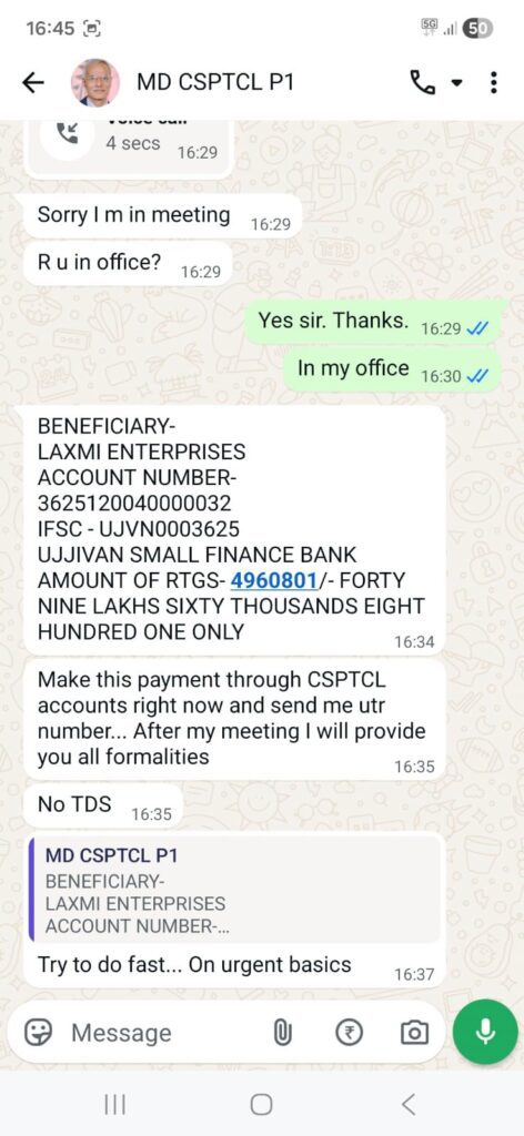 रायपुर 13 अप्रैल 2026। छत्तीसगढ़ स्टेट पॉवर ट्रांसमिशन कंपनी के प्रबंध निदेशक श्री राजेश कुमार शुक्ला के नाम का दुरुपयोग करते हुए अज्ञात व्यक्तियों व्दारा अधिकारियों को ठगने का प्रयास किया गया। अधिकारियों की सजगता एवं सतर्कता से ठगों के मनसूबे नाकाम हो गए और इसकी शिकायत टोल फ्री नंबर 1930 में कर दी गई है। ट्रांसमिशन कंपनी के कुछ अधिकारियों को आज दोपहर में एक फर्जी मोबाइल नंबर 99315-25803 से व्हाट्सएप के माध्यम से संदेश भेजे गए, जिनमें स्वयं को एमडी बताते हुए यह कहा गया कि वे किसी महत्वपूर्ण बैठक में व्यस्त हैं और तत्काल प्रभाव से एक बड़ी राशि 49 लाख 60 हजार 801 आरटीजीएस के माध्यम से एक निर्दिष्ट खाते में स्थानांतरित की जाए। संदेश में जल्दबाजी का माहौल बनाते हुए अधिकारियों पर तुरंत कार्रवाई करने का दबाव भी बनाया गया, जो कि साइबर ठगों द्वारा अपनाई जाने वाली सामान्य रणनीति मानी जाती है। मैसेज में बैंक का नाम, खाता संख्या, आईएफएसई कोड और लाभार्थी के संस्थान का नाम लिखा था।