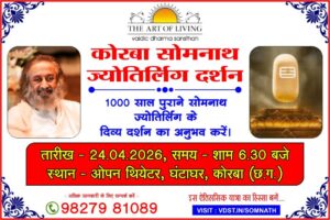 कोरबा 18 अप्रैल 2026 / शहरवासियों एवं श्रद्धालुजनों के लिए अत्यंत हर्ष और सौभाग्य का विषय है कि के सान्निध्य में आगामी 24 अप्रैल 2026 को सायं 6 बजे से 9 बजे तक के घंटाघर ओपन थिएटर में भव्य श्री सोमनाथ ज्योतिर्लिंग दिव्य दर्शन कार्यक्रम आयोजित किया जा रहा है। इस पावन अवसर पर श्रद्धालुओं को दिव्य शिवलिंग के दर्शन, भजन, ध्यान, सत्संग एवं आध्यात्मिक अनुभूति का अनुपम लाभ प्राप्त होगा।