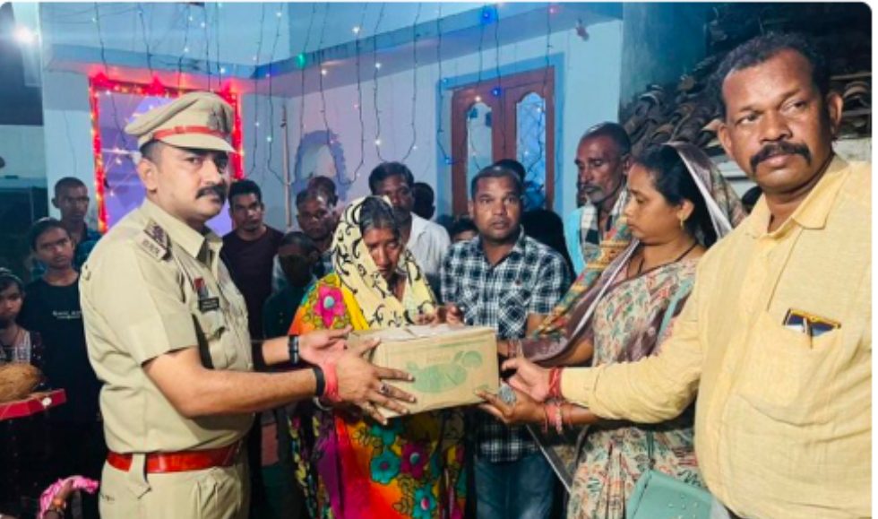 Katghora Police Station in-charge Dharam Narayan Tiwari paid tribute to martyr Vinod Bharia and met his family on Diwali.