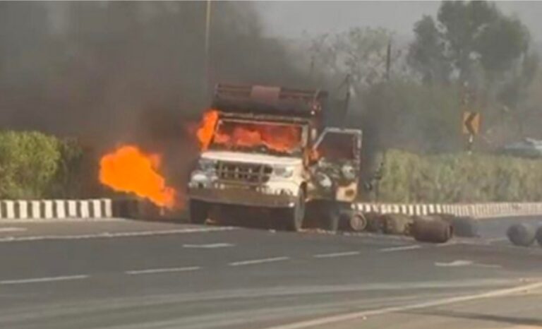 A gas cylinder exploded on NH-53, setting a pickup ablaze.