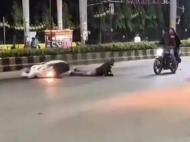 Oil spilled from a pickup truck causes accidents, injuring several two-wheeler riders at Subhash Chowk