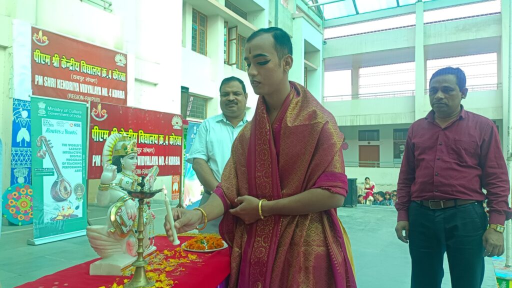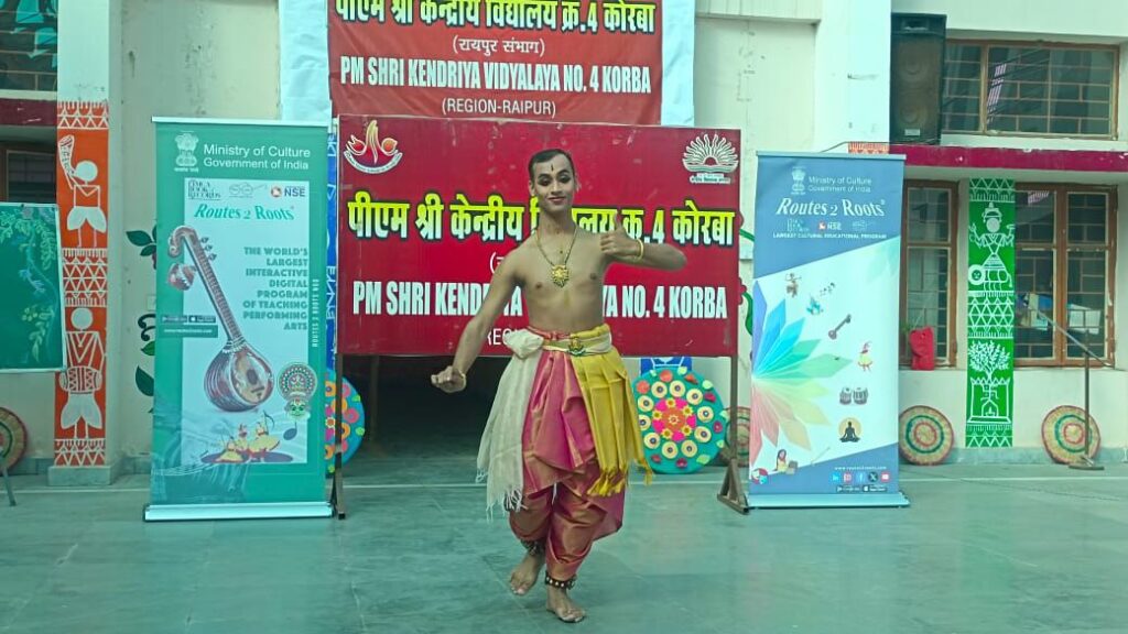 सोमवार, 3 नवंबर 2025/केंद्रीय विद्यालय क्रमांक 4, कोरबा में कलाकार आसिफ हुसैन द्वारा भरतनाट्यम की मूल बातें सिखाने के लिए एक कार्यशाला का आयोजन किया गया। यह कार्यशाला रूट्स टू रूट्स की एक पहल थी, जिसका उद्देश्य दूर-दराज के शहरों तक पहुँचकर छात्रों को कला और संस्कृति से परिचित कराना है।