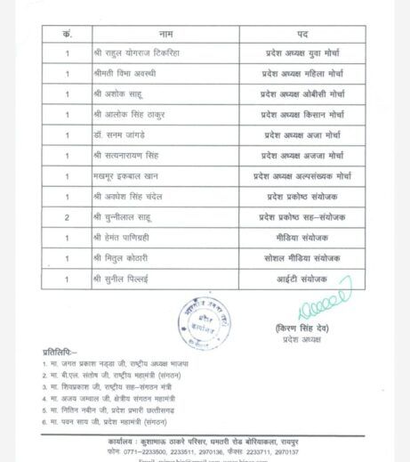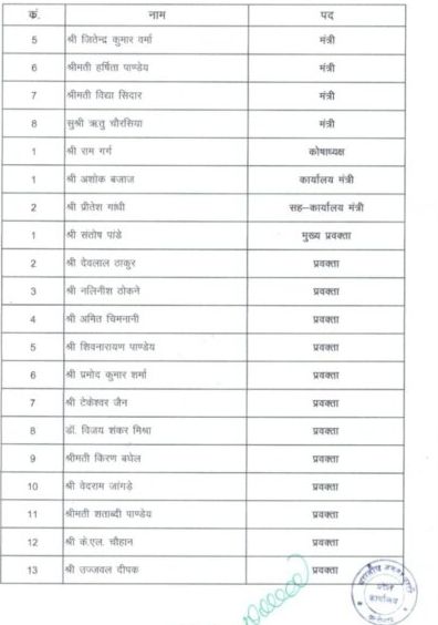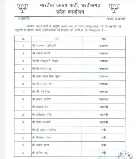 भाजपा की प्रदेश कार्यकारिणी घोषित, प्रदेश पदाधिकारियों की हुई नियुक्ति, देखिये लिस्ट…