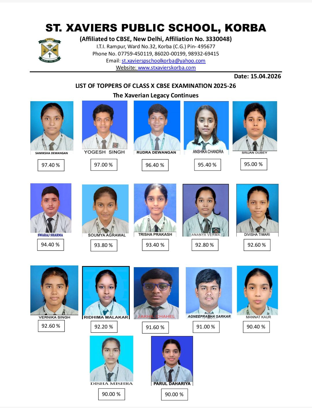 सीबीएसई, दिल्ली द्वारा आज दिनांक 15 अप्रैल 2026 को कक्षा 10वीं का परीक्षा परिणाम घोषित किया गया, जिसमें सेंट जेवियर्स पब्लिक स्कूल, कोरबा के विद्यार्थियों ने उत्कृष्ट प्रदर्शन करते हुए विद्यालय का नाम गौरवान्वित किया।